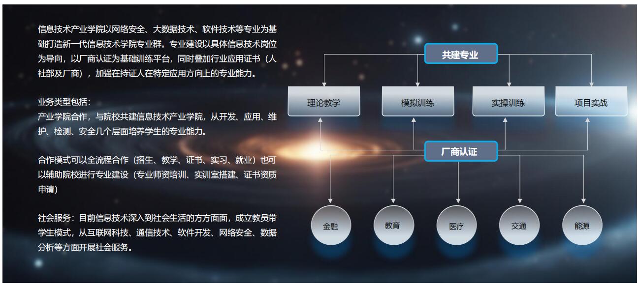 为顺应数字时代发展需求,携手高校共建信息技术产业学院,以网络安全、大数据技术、软件技术等专业为核心,打造新一代信息技术专业群。